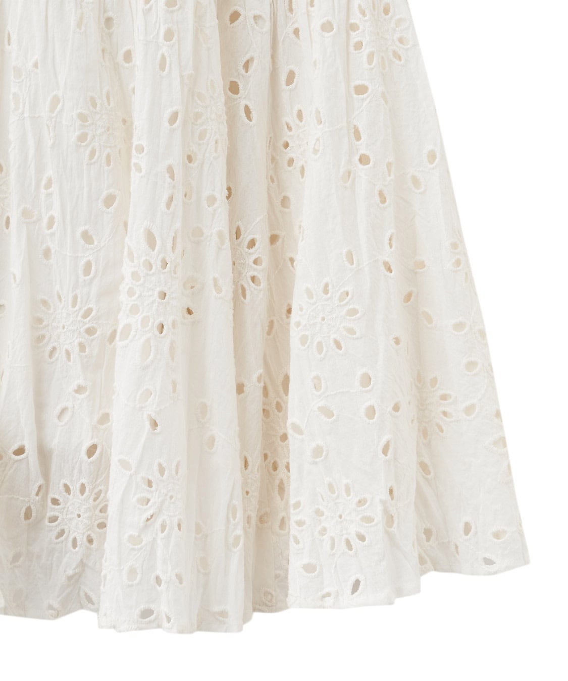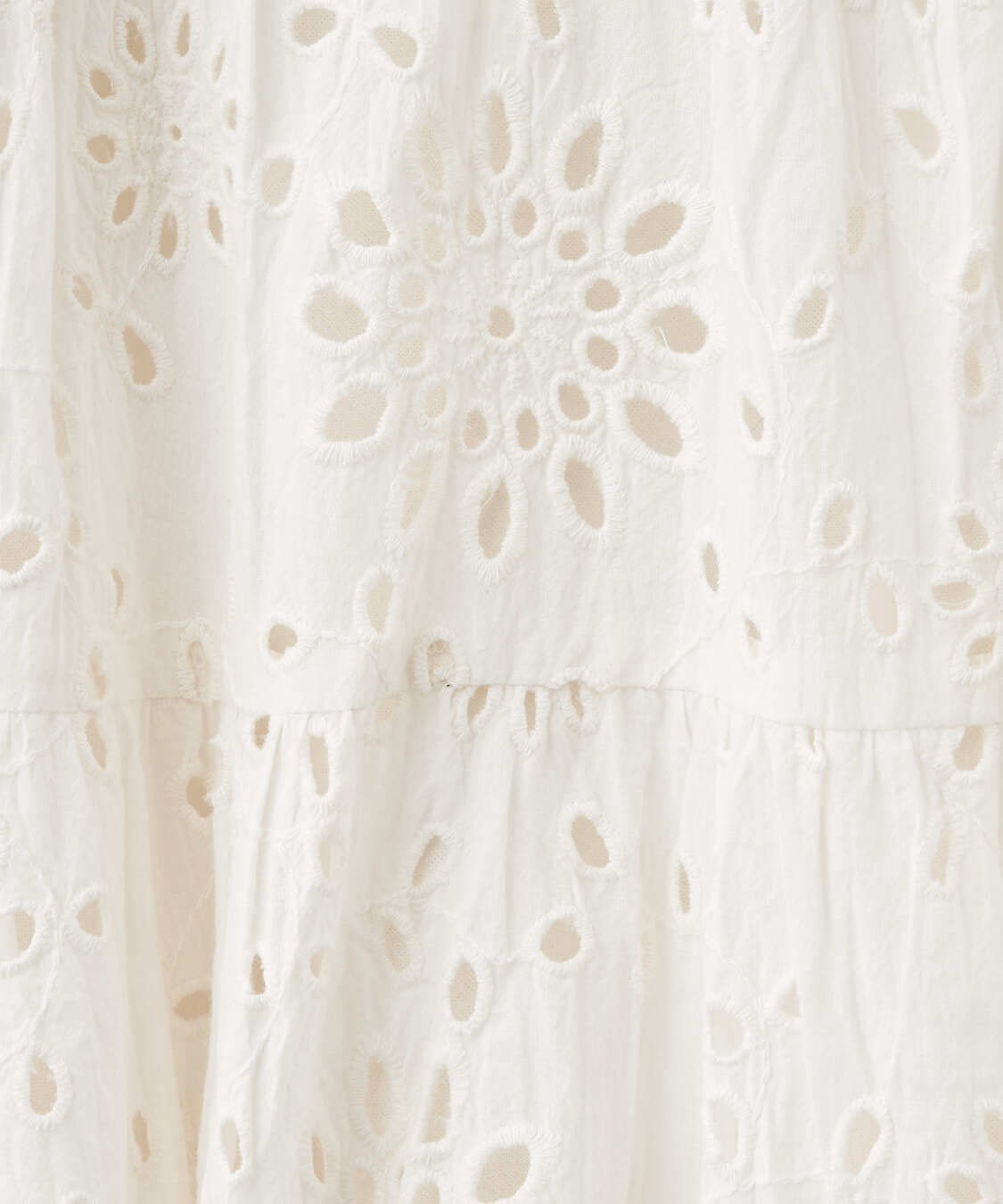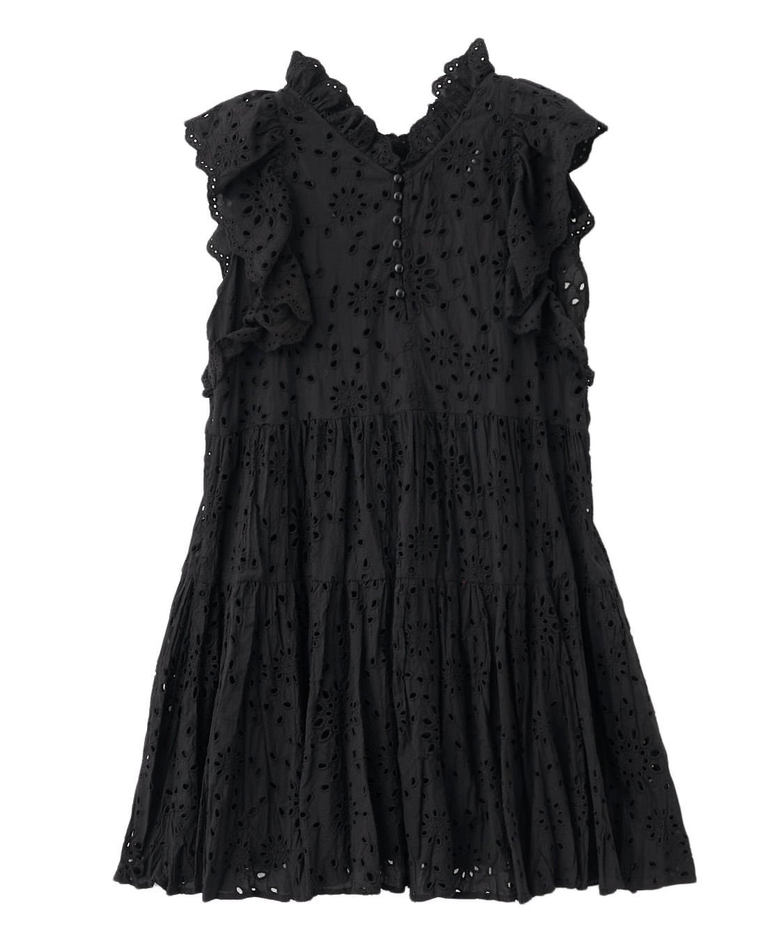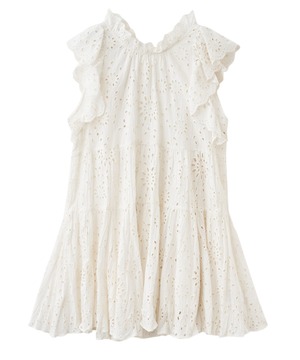 オリジナルで作成した総柄のアイレット刺繍が目を惹くミニワンピース。インド生産ならではの表情のあるコットン素材にオリジナル刺繍を施すことで、程よいフェミニン感がありながらも大人っぽく着られるバランスに。衿と袖の大胆な大ぶりフリルにはスカラップ刺繍を施すことで華やかさをプラス。裾に向かって広がるティアードデザインでありながらも、縦皺をいれることで程よい分量感に。前のボタンを開けると抜け感を出すことが出来、ボタンを後ろにするとつまった衿がモードに魅せてくれる、前後2WAYに仕上げました。1枚で映えるのでミニワンピースとして着て頂くのはもちろん、パンツ合わせでチュニックとしても着て頂けます。
