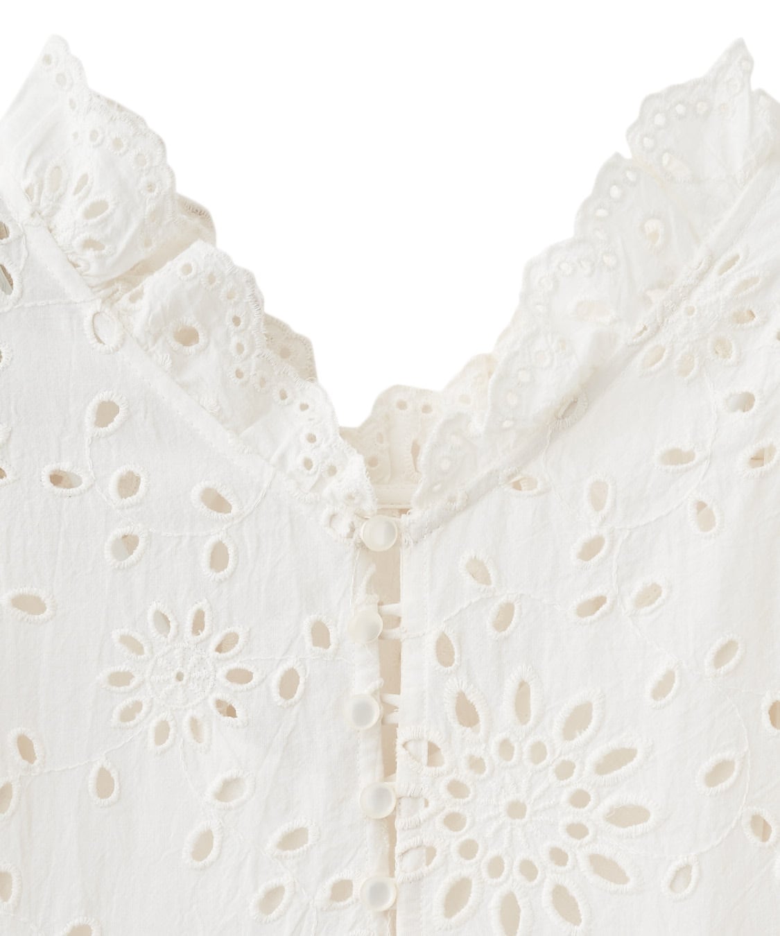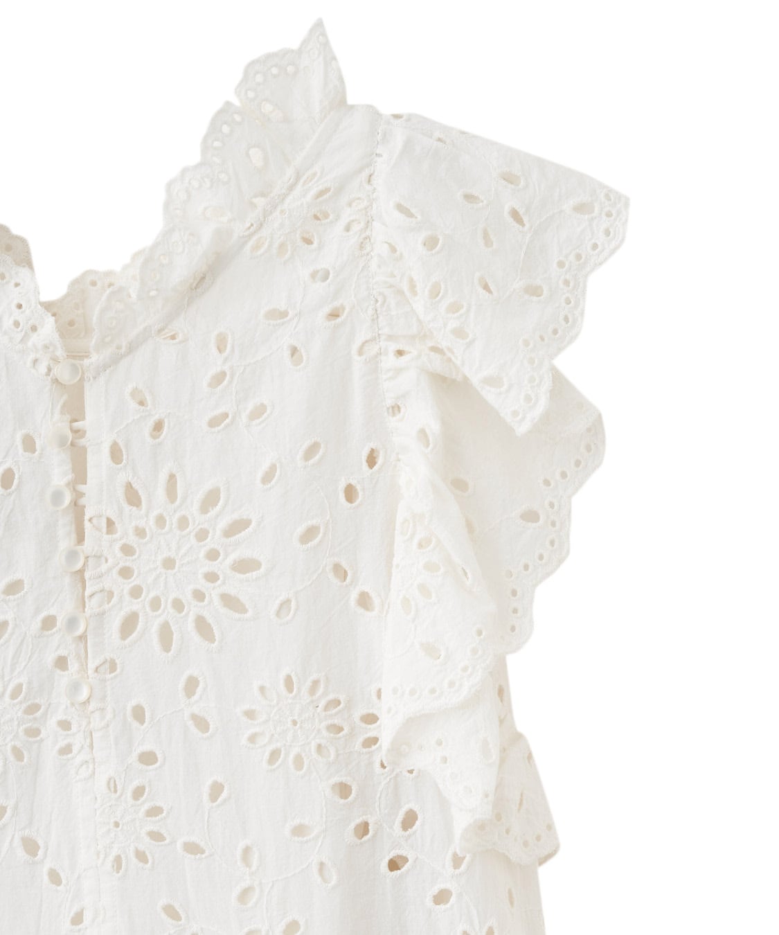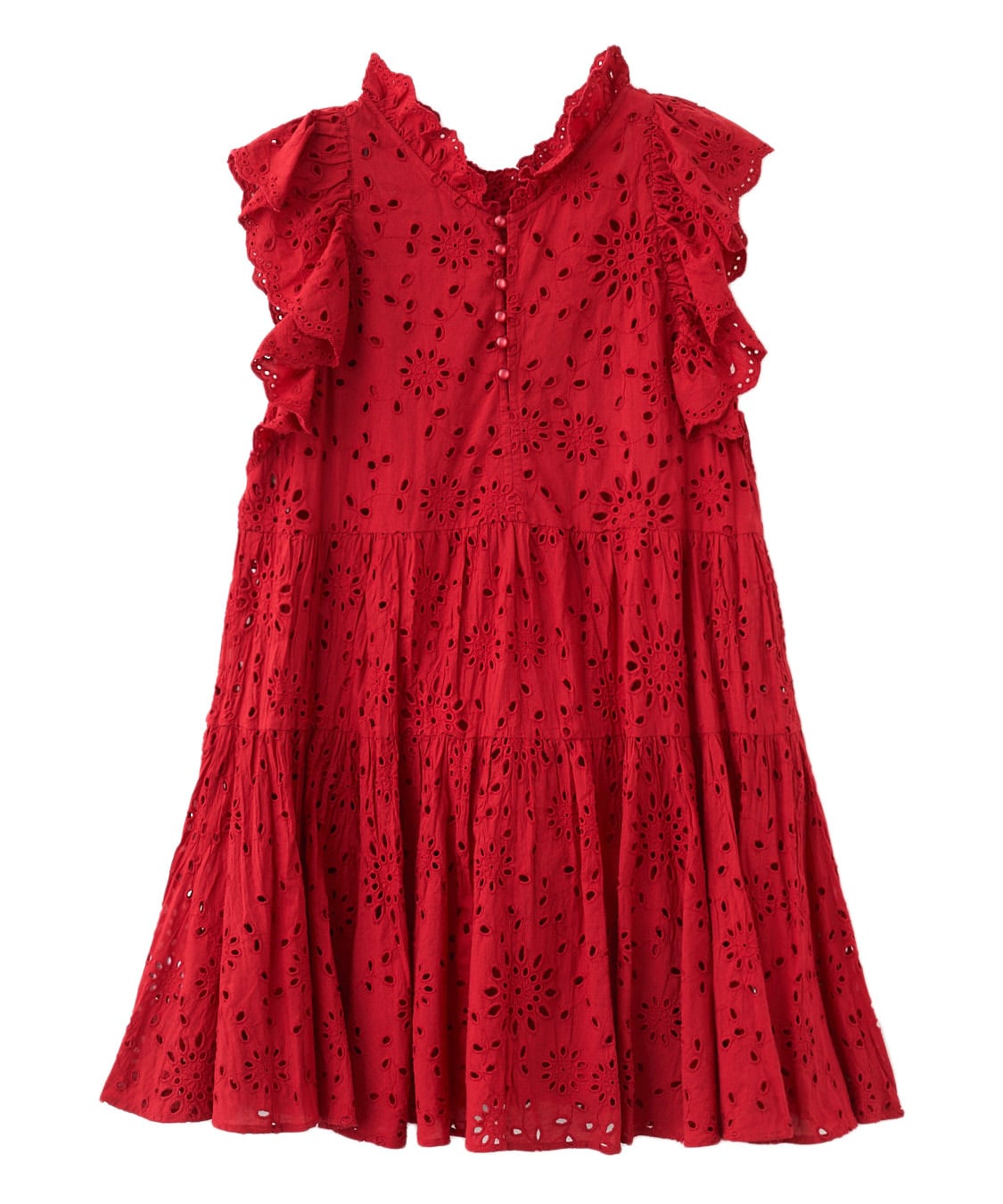 オリジナルで作成した総柄のアイレット刺繍が目を惹くミニワンピース。インド生産ならではの表情のあるコットン素材にオリジナル刺繍を施すことで、程よいフェミニン感がありながらも大人っぽく着られるバランスに。衿と袖の大胆な大ぶりフリルにはスカラップ刺繍を施すことで華やかさをプラス。裾に向かって広がるティアードデザインでありながらも、縦皺をいれることで程よい分量感に。前のボタンを開けると抜け感を出すことが出来、ボタンを後ろにするとつまった衿がモードに魅せてくれる、前後2WAYに仕上げました。1枚で映えるのでミニワンピースとして着て頂くのはもちろん、パンツ合わせでチュニックとしても着て頂けます。