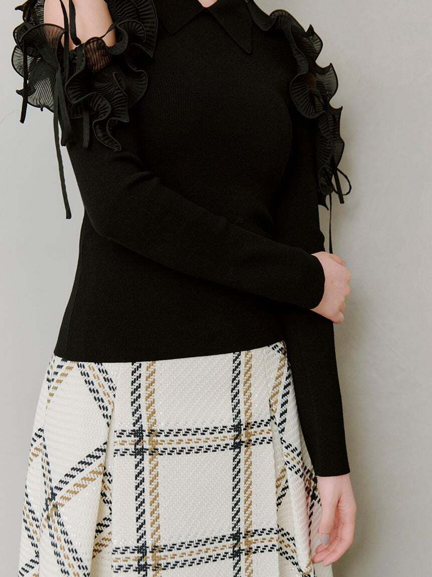 SNIDELで人気のプリーツフリルを着心地の良いキレイめニットにドッキングさせた、女性らしく華やかなニットトップスを今季らしくアップデート。ハイゲージニットをシャツ襟風に編み立て、襟デザインを加えました。キレイめフェミニンなニットにプレッピー要素がプラスされ新鮮な表情に。袖はショルダー部分が大胆にカットされ、細リボンを配置しています。アメスリ位置に入った立体的なフリルデザインが、肩周りをすっきりと見せ、上手にカバーしてくれるので、細見え効果も抜群です。フィット感のあるデザインで、さまざまなボトムに合わせやすいアイテムです。後ろの襟元のボタンを外して着脱いただけます。