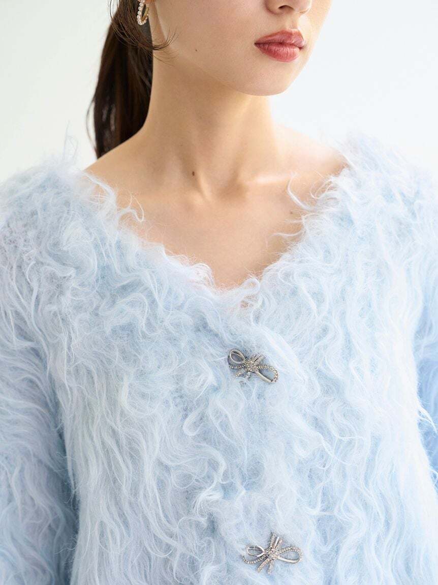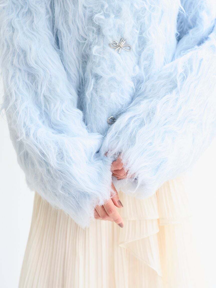 カールのかかったシャギーニット地がスタイリングに華やぎをプラスする、ざっくりと羽織れるデザインカーディガンがお目見え。膨らみのあるニット地で、コートの代わりにも着られる温かみのあるアイテムです。V開きを広めに開け、肩を抜いてコケットにもご着用いただけるようにシルエットにこだわってお作りしました。キラキラビジューを施した、アクセサリーのようなリボンデザインのメタルボタンがポイント。