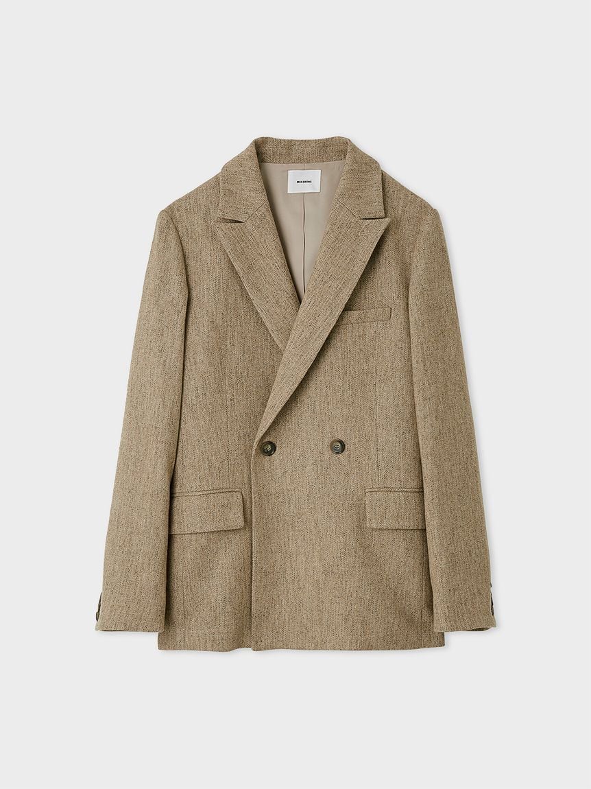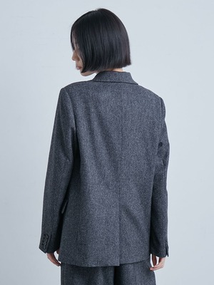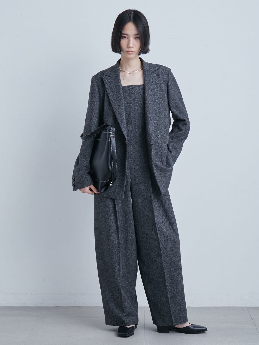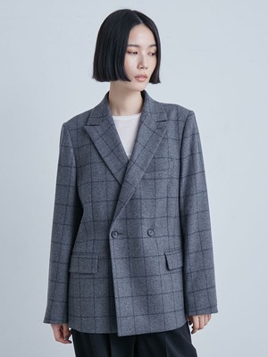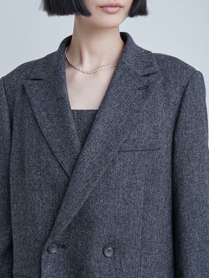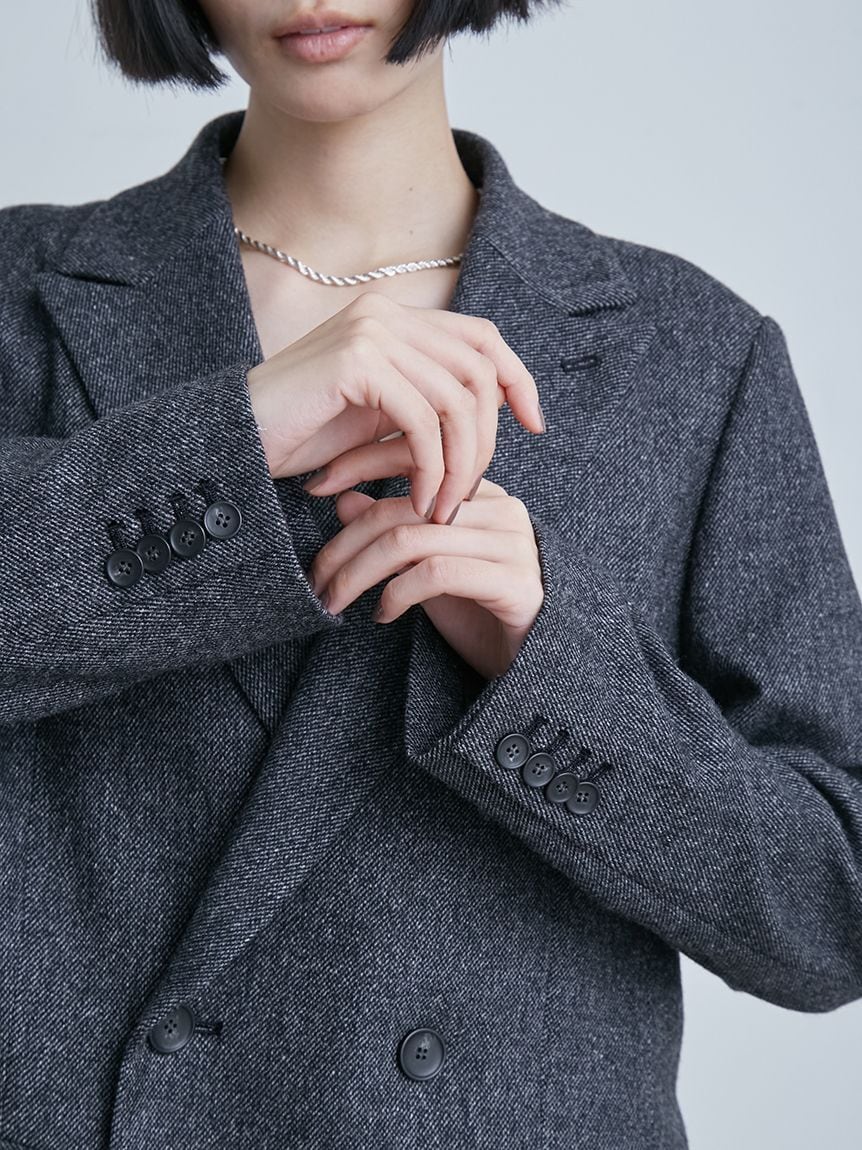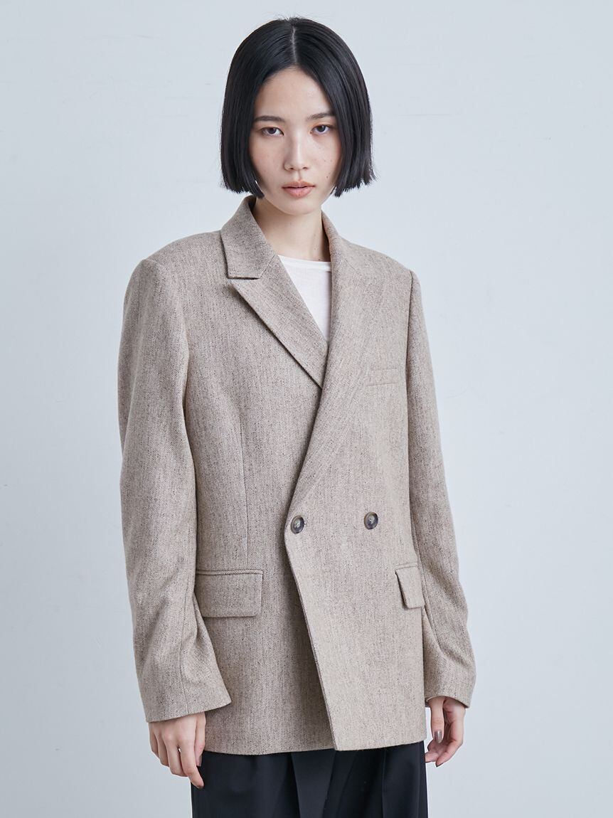 ややオーバーなシルエットのダブルブレストジャケットを、細部まで計算されたパターンで女性らしいシルエットに仕上げています。