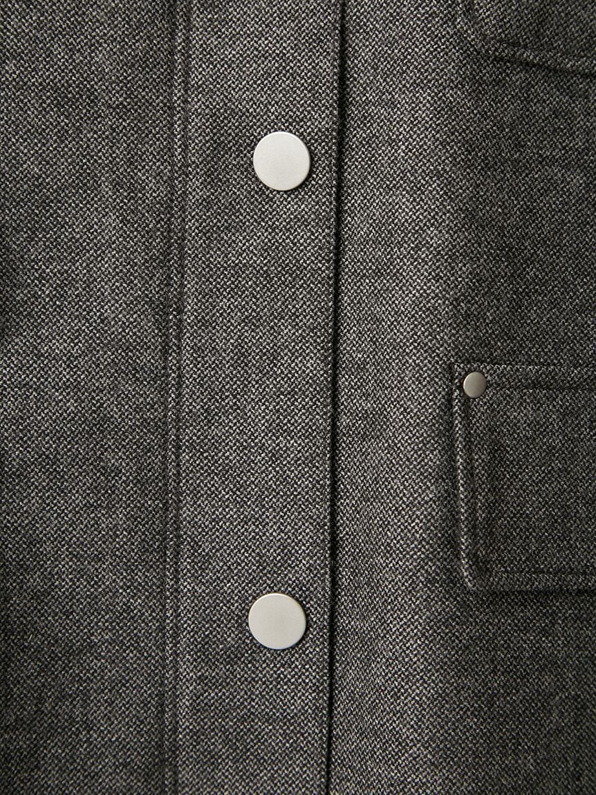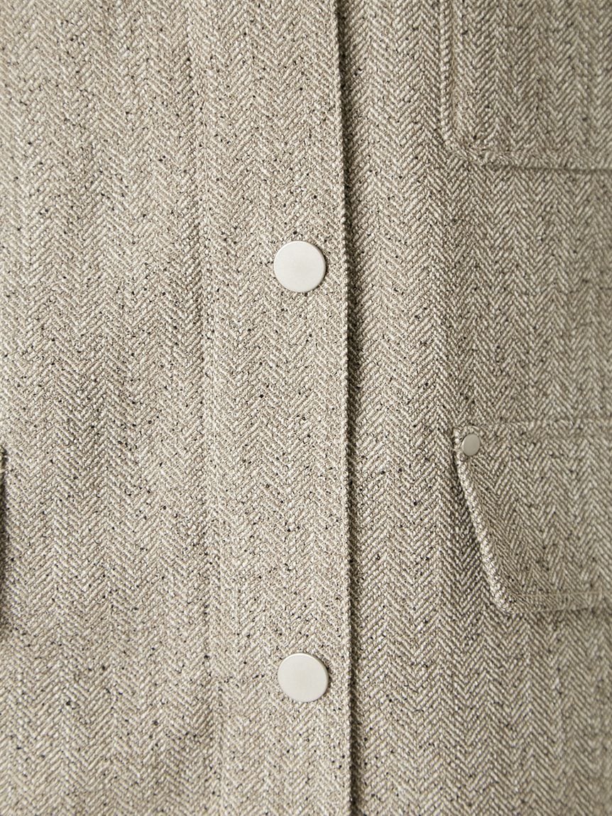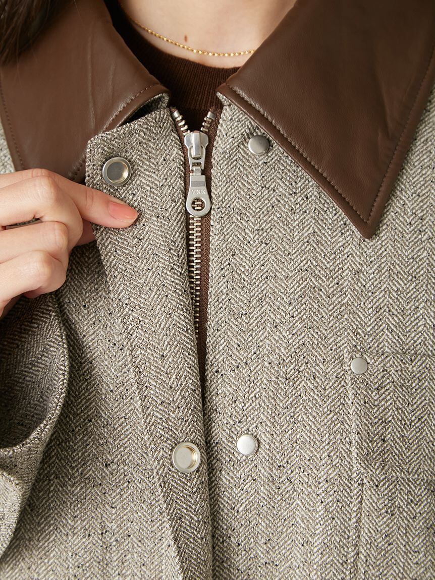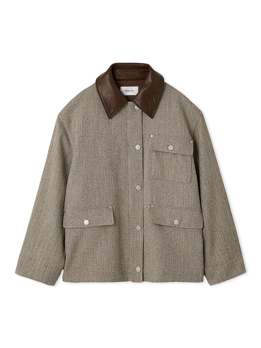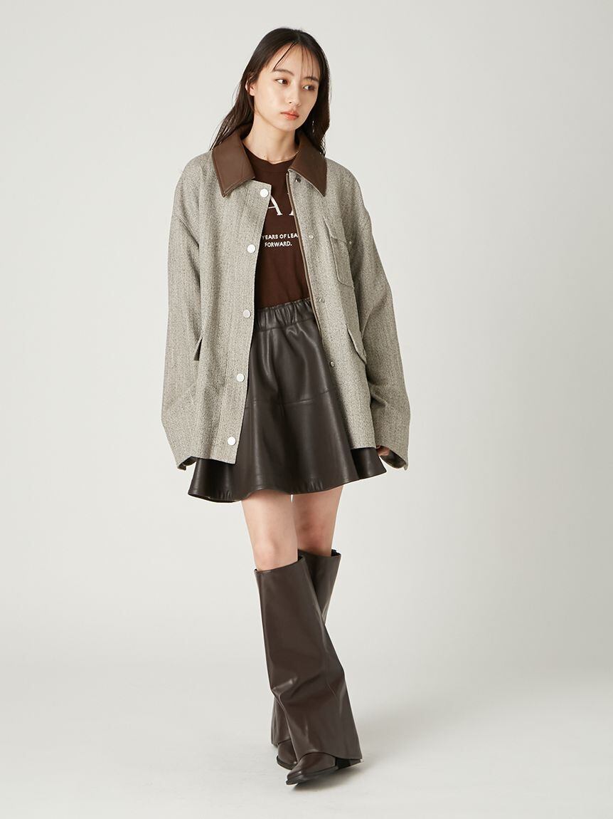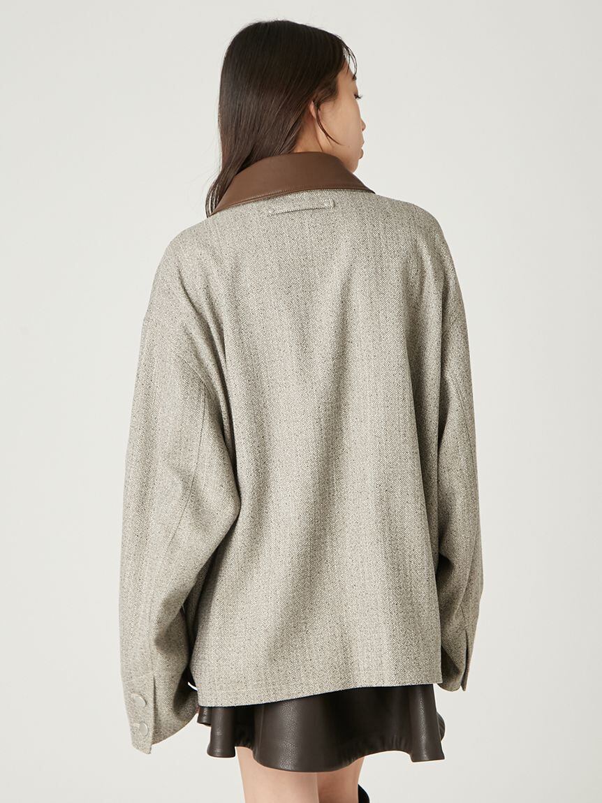 BEGは、リサイクルポリエステルを使用した軽やかなヘリンボーン柄ツイードです。襟はフェイクレザー。
