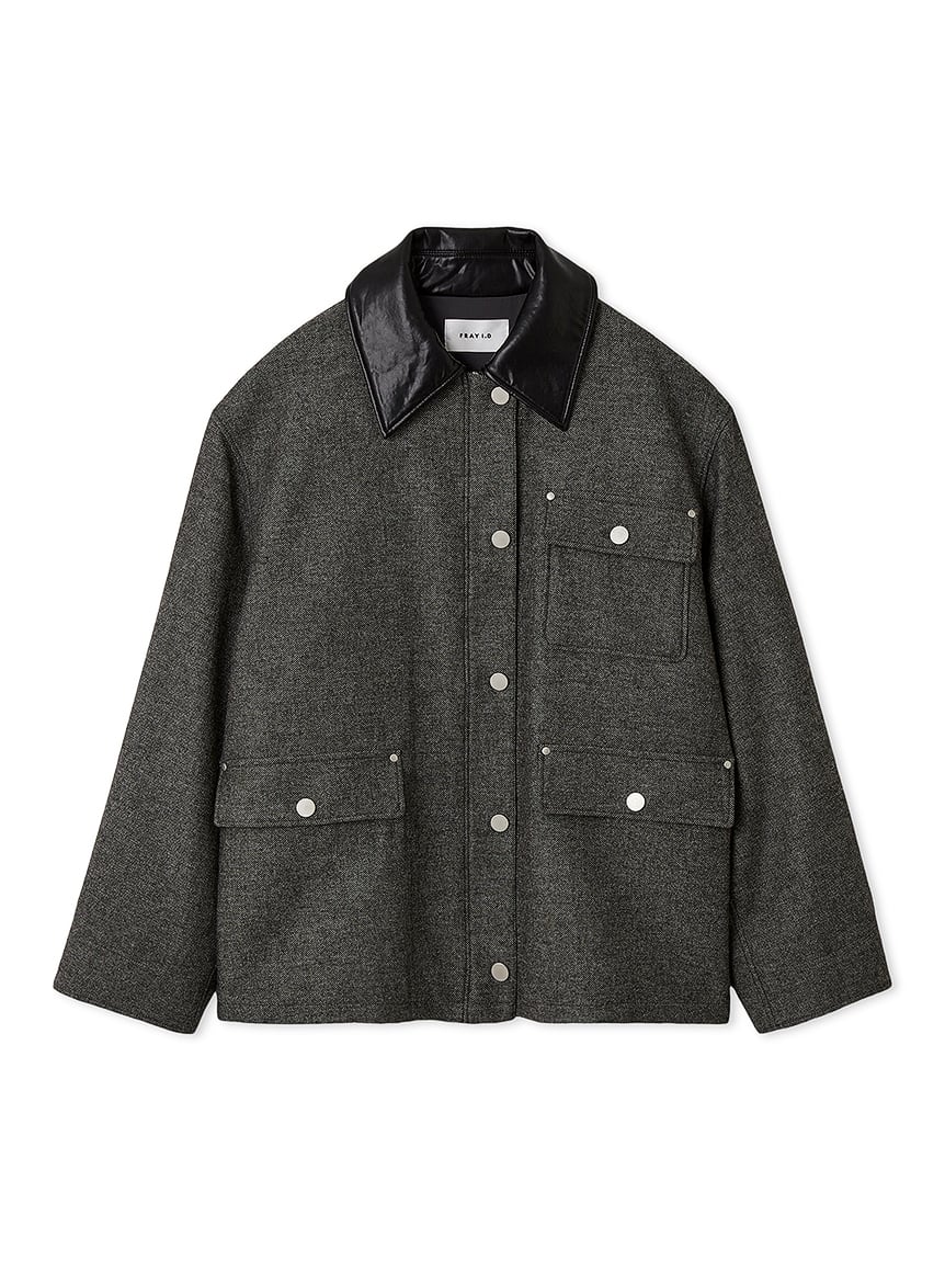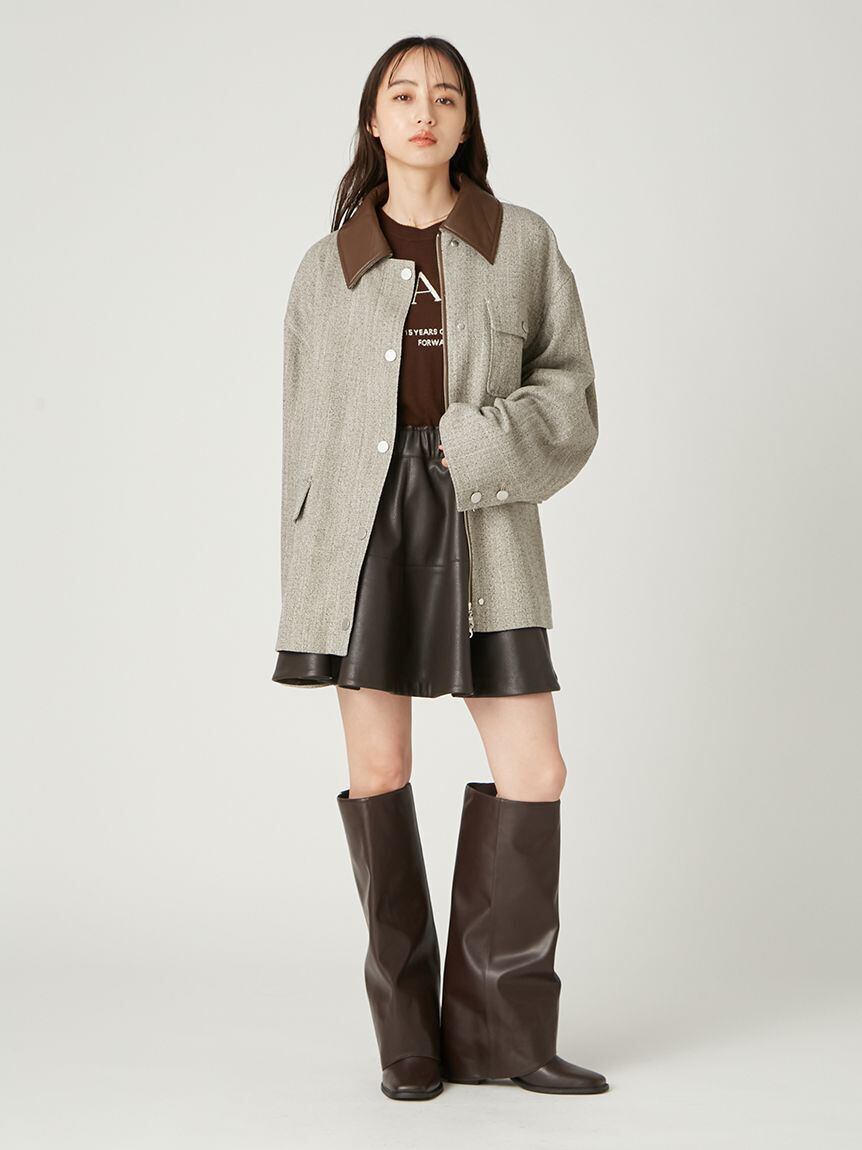 GRYは、ウール、レーヨン、ポリエステルをミックスしたエレガントなツイード調。襟はフェイクレザー。
